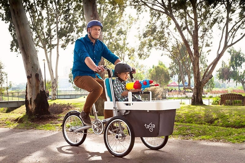 Model Taga 2.0 je perfektný rodinný bicykel - je navrhnutý s 3 kolesami a môže pojať až 3 deti, 2 v prednom batožinovom priestore (s pridaním detských sedadiel ako voliteľného príslušenstva) a ďalšie s použitím ľubovoľnej cyklosedačky, upevňujúcej sa na zadné sedadlo.