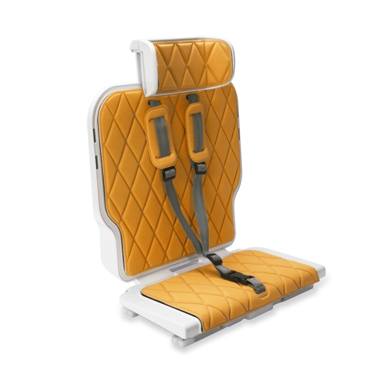 Detské sedadlo perfektne sedí upevnené v prednom nákladnom koši Cargo, je polohovateľné, s výškovo nastaviteľnou opierkou hlavy, vybavené 3 bodovým bezpečnostným pásom a pohodlným polstrovaním vo farbe podľa vlastného výberu.