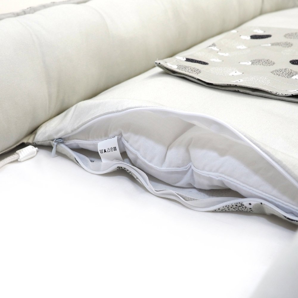 Hniezdo je možné používať obojstranne. Má praktickú šnúrku po obvode, ktorou je možné si jeho veľkosť upraviť podľa potreby. Aby sme docielili ešte väčšiu bezpečnosť, zaväzovanie je prekryté pásom na suchý zips, ktorý zároveň pomáha ešte lepšie držať tvar hniezda. Jeho ložná plocha je odzipsovateľnávnútorná výplň je vyberateľná, čo je z praktického hľadiska veľká výhoda. Umožňuje tým totiž oveľa ľahšiu manipuláciu pri jeho údržbe. Obvodový pás je vyplnený certifikovaným guľôčkovým dutým vláknom a vyberateľná výplň ložnej plochy je vyrobená zo 100% bavlny a dutého vlákna hrúbky 2cm.
