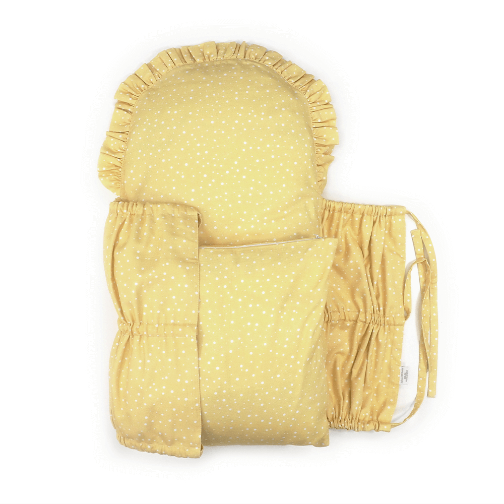 Perinka SOFTELLO je vyrobená z kvalitného bavlneného saténu s našim vlastným originálnym dizajnom. Tento materiál je na dotyk v porovnaní s klasickou bavlnou oveľa príjemnejší a hebkejší, a preto zaručí vášmu bábätku príjemné teplo. Má tvar obdĺžnika, a zaoblenú stranu zdobí malý volánik. Zaväzuje sa tromi šnúrkami, pevne všitými v bočných dieloch, takže nemusíte mať obavu, že by sa vám šnúrka mohla vyvliecť. Vnútornú výplň je možné vybrať, čím značne zjednodušuje jej údržbu a predlžuje jej životnosť.