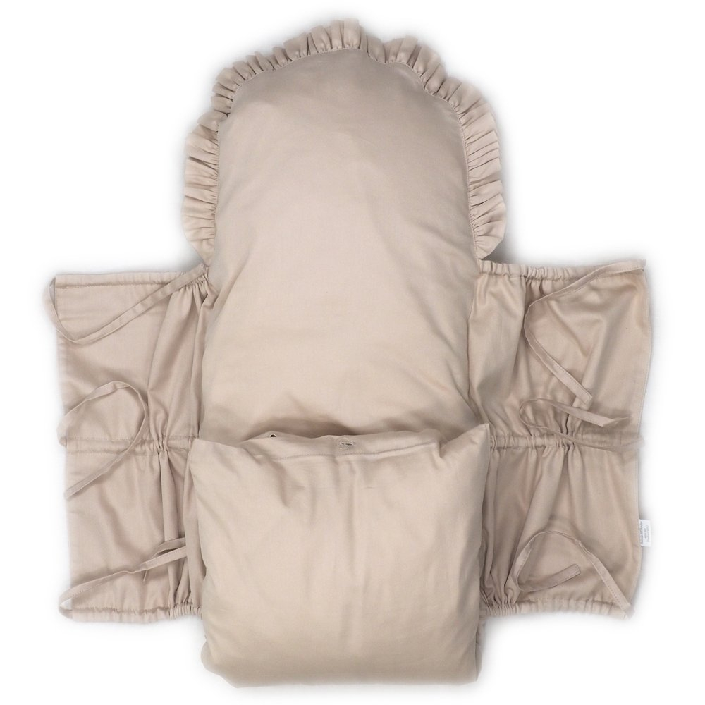 Perinka SOFTELLO je vyrobená z kvalitného bavlneného saténu s našim vlastným originálnym dizajnom. Tento materiál je na dotyk v porovnaní s klasickou bavlnou oveľa príjemnejší a hebkejší, a preto zaručí vášmu bábätku príjemné teplo. Má tvar obdĺžnika, a zaoblenú stranu zdobí malý volánik. Zaväzuje sa tromi šnúrkami, pevne všitými v bočných dieloch, takže nemusíte mať obavu, že by sa vám šnúrka mohla vyvliecť. Vnútornú výplň je možné vybrať, čím značne zjednodušuje jej údržbu a predlžuje jej životnosť.