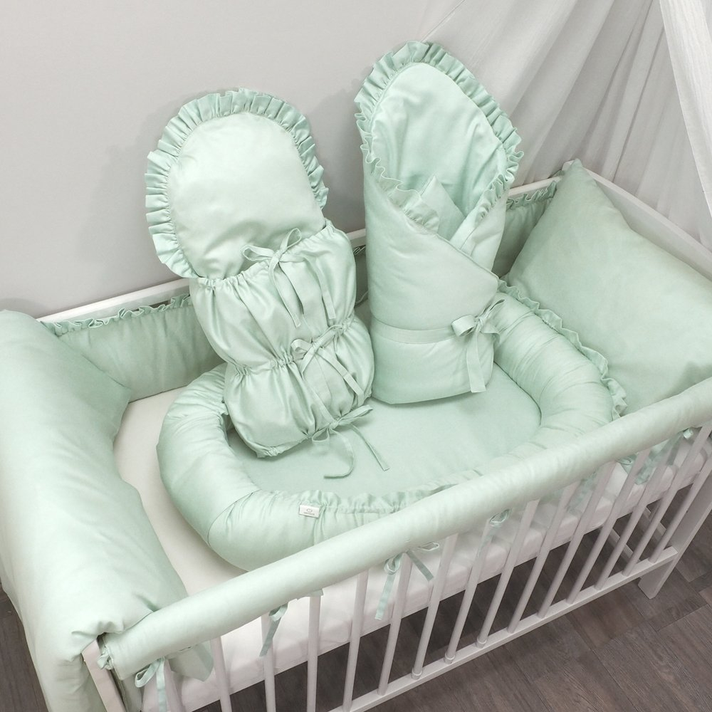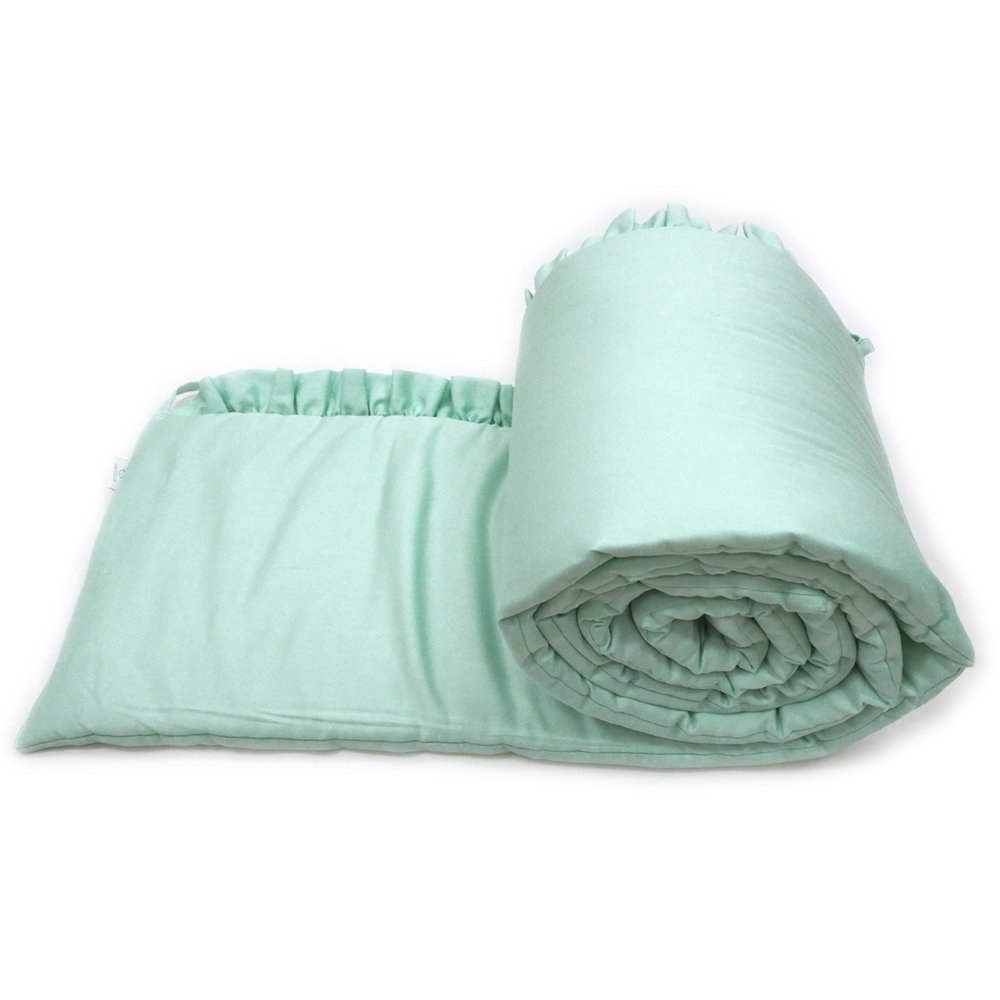 Mantinel SOFTELLO svetlozelenej farby je vyrobený z kvalitného bavlneného saténu. Tento materiál je na dotyk v porovnaní s klasickou bavlnou oveľa príjemnejší a hebkejší. Má tvar dlhého obdĺžnika s rozmerom 30x240cm, ktorý o postieľku pohodlne upevníte viacerými šnúrkami.