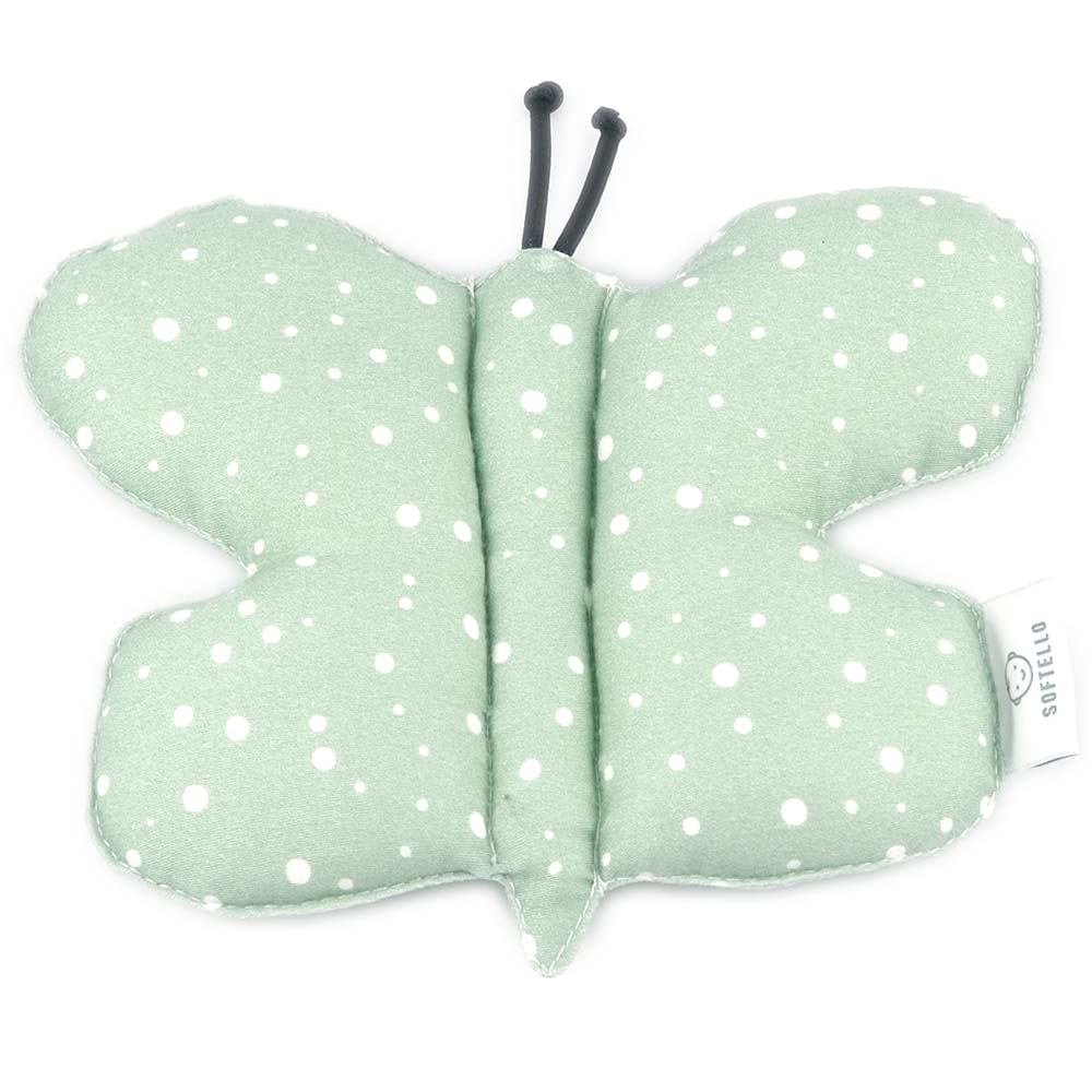 Látková hrkálkamotýlikSOFTELLO v obľúbenom bodkovanom vzore, je milým darčekom aj pre to najmenšie dieťatko. Motýlik v sebe ukrýva drobnú hrkálku, ktorá vydáva jemný zvuk, ktorý je ideálny aj pre bábätko. Motýlik je ušitý z certifikovaného bavlneného saténu. Je preto veľmi príjemný na dotyk a vhodný na kontakt aj s tou najcitlivejšou detskou pokožkou. Vďaka svojej mäkkosti je pre bábätko bezpečnejší ako klasické plastové hrkálky.