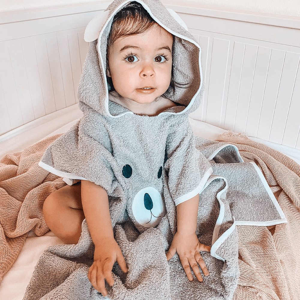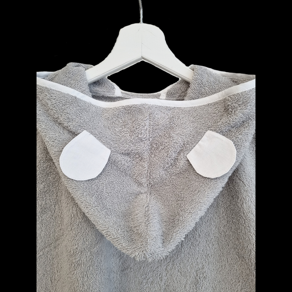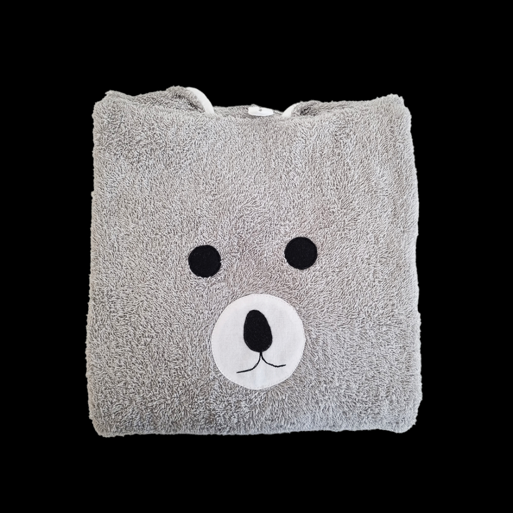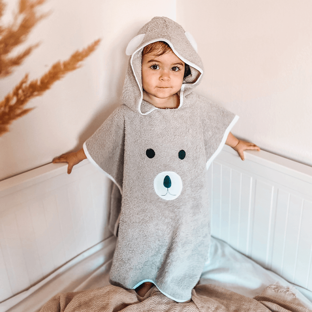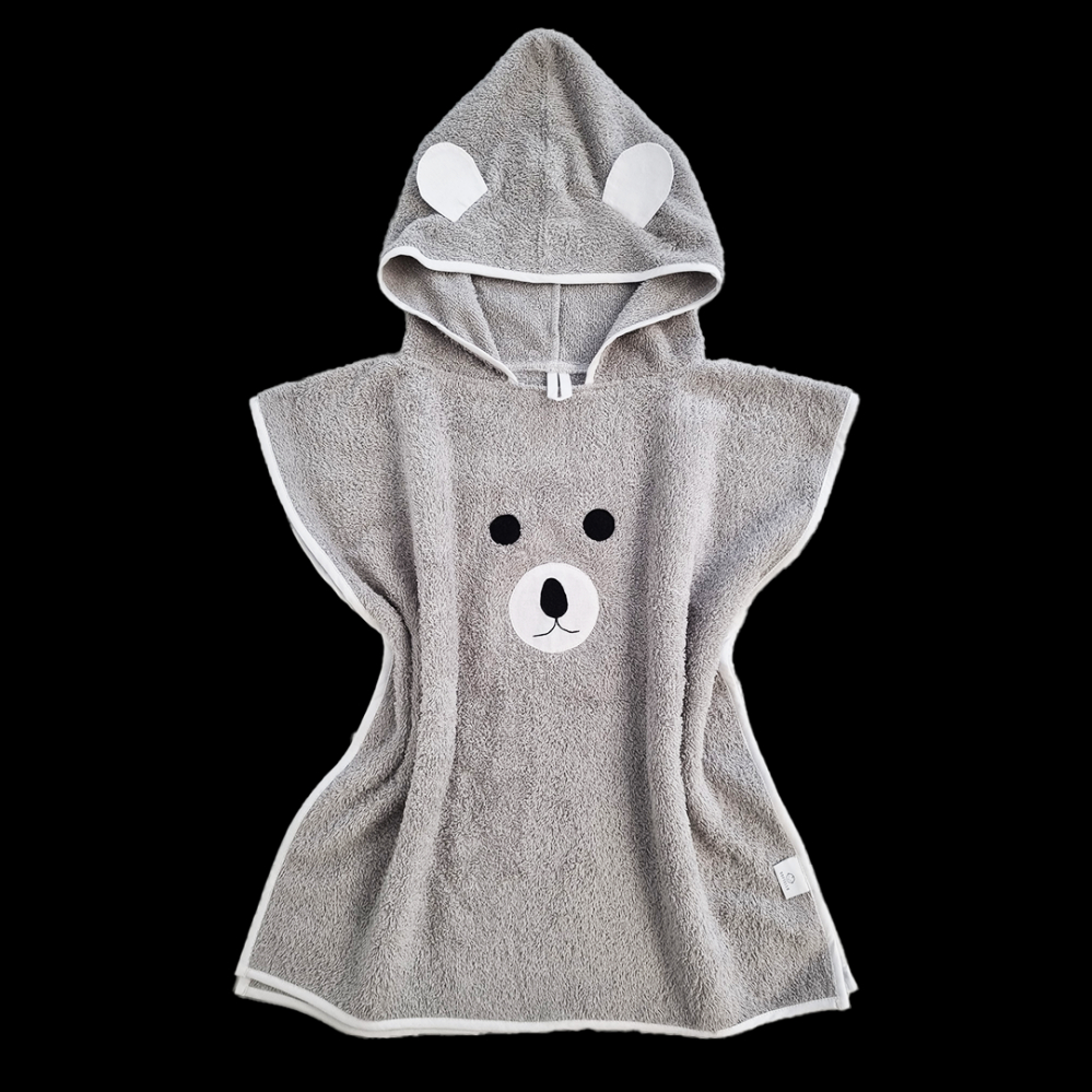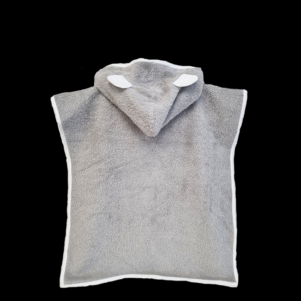 Detské kúpacie pončo v dizajne sivý macko je skvelým pomocníkom nie len pri večernom kúpaní vášho dieťatka, ale napríklad aj na kúpaliskách, či akvaparkoch. Pončo je vyrobené z jemnučkého bavlneného froté, ktoré zároveň disponuje dostatočnou savosťou. Detské pončo obsahuje aj kapucňu s uškami na vysušenie hlavičky a praktické uško na zavesenie.