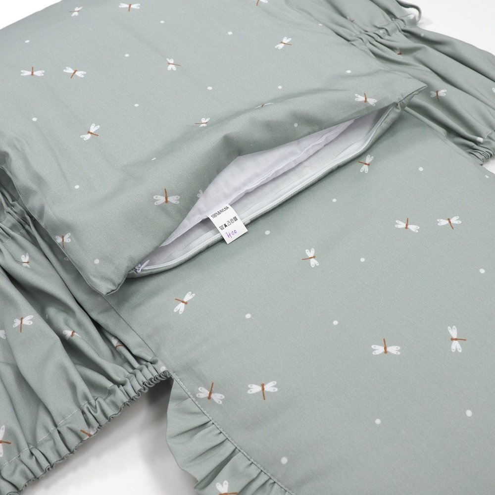 Perinka SOFTELLO je vyrobená z kvalitného bavlneného saténu s našim vlastným originálnym dizajnom. Tento materiál je na dotyk v porovnaní s klasickou bavlnou oveľa príjemnejší a hebkejší, a preto zaručí vášmu bábätku príjemné teplo. Má tvar obdĺžnika, a zaoblenú stranu zdobí malý volánik. Zaväzuje sa tromi šnúrkami, pevne všitými v bočných dieloch, takže nemusíte mať obavu, že by sa vám šnúrka mohla vyvliecť. Vnútornú výplň je možné vybrať, čím značne zjednodušuje jej údržbu a predlžuje jej životnosť.