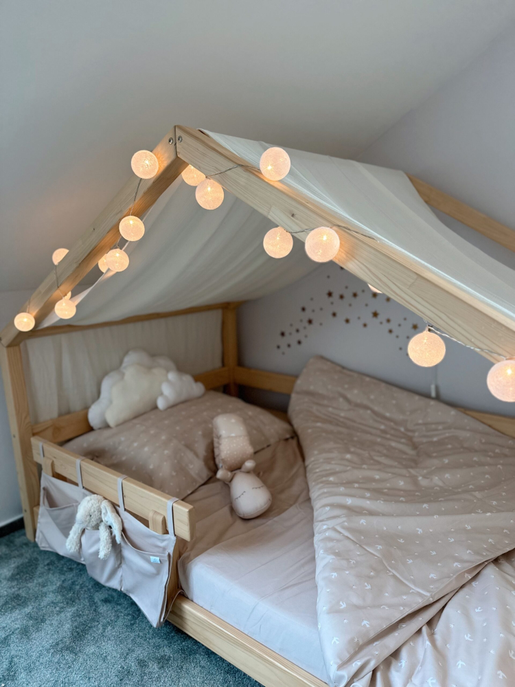 Baldachýn SOFTELLO v smotanovej farbe nad posteľ je veľmi pekným doplnkom každej detskej izbičky. Táto nádherná dekorácia vytvorí z každej detskej domčekovej postele útulné aj bezpečné miesto na spanie, zároveň ju premení aj na hrací kútik či detskú skrýšu.