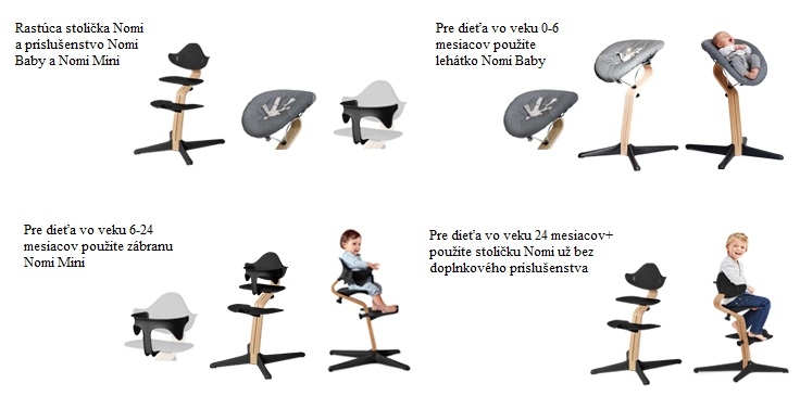 Vysoká stolička NOMI je jadrom konceptu Nomi (obrázok 2). Je vhodná pre deti od cca 2 rokov až pre násťročných (a viac). Vašu rastúcu stoličku NOMI môžete kombinovať s voliteľným príslušenstvom, aby ste ju prispôsobili potrebám vášho rastúceho dieťaťa - priamo od prvého dňa vášho novorodenca.