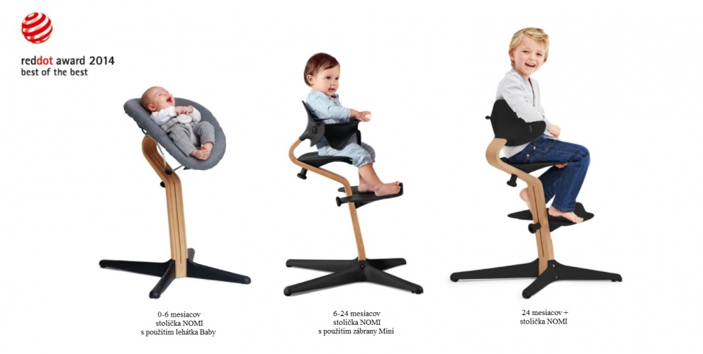 Stolička NOMI bola vyvinutá z ambície vytvoriť celosvetovo najlepšiu rastúcu stoličku pre deti s požiadavkou na tvar a funkčnosť. Stolička Nomi sa dá jednoducho nastaviť bez použitia nástrojov a bude sa vyvíjať s meniacimi sa potrebami pre oporu za rodinným stolom. Mäkké organické kontúry sú príjemné na pohľad a lákajú dieťa ostať aktívne a v pohybe v mnohých rozličných polohách na sedenie.